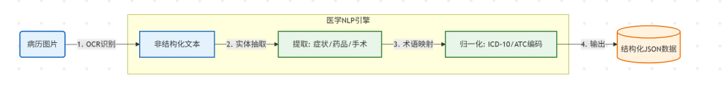 - 术语归一化: 医生写的“大三阳”、“乙肝”需要统一映射为标准 ICD-10 编码。